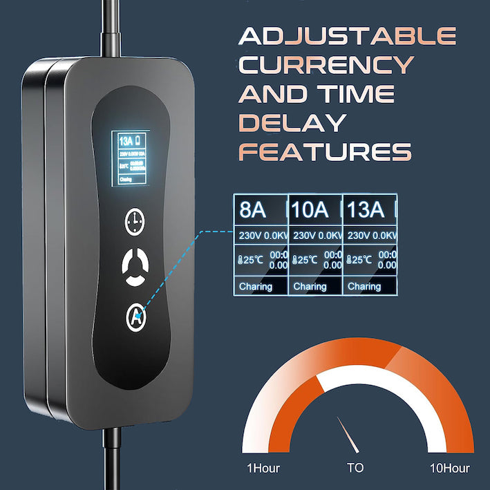 The Adjustable Energy Electric Vehicle Charger is designed with advanced features to provide safe and efficient charging for electric vehicles. Its charging gun head is IP55 rated, ensuring the controller casing is dust-proof, and it has an IP54 water resistance rating, effectively preventing water splashes. The charger offers one-key timing functionality, allowing users to schedule charging during off-peak hours for cost savings and environmental benefits.